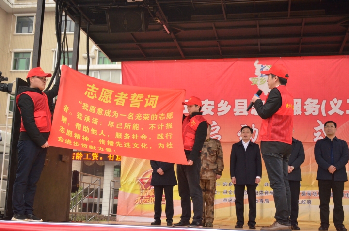 启动仪式上,安乡县委常委、宣传部部长李碧波为活动致辞;县教育局负责人代表义工服务队作表态发言;县领导分别为各义工服务队及安乡义工服务总队授旗;安乡义工服务总队负责人带领义工代表队进行集中宣誓。