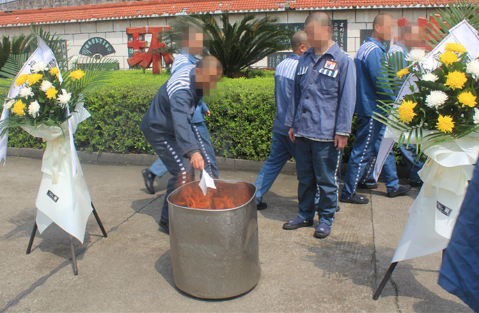宣誓过后,一至五监区的五名服刑人员代表依次上前,致已故亲人缅怀书,表达追思之情。“爸爸妈妈,儿子今天不能给您二老上坟磕头,心里实在难受,我一定在监狱好好改造,早日出狱,去坟前看望你们。”“爷爷,孙儿不孝,一失足成千古恨,还没来得及送您一程,看您一眼…”字里行间,满溢思念之苦,追念之郁,表达了对已故亲人的追思。满怀思念与感恩,全体服刑人员一一焚烧追思卡、缅怀书。