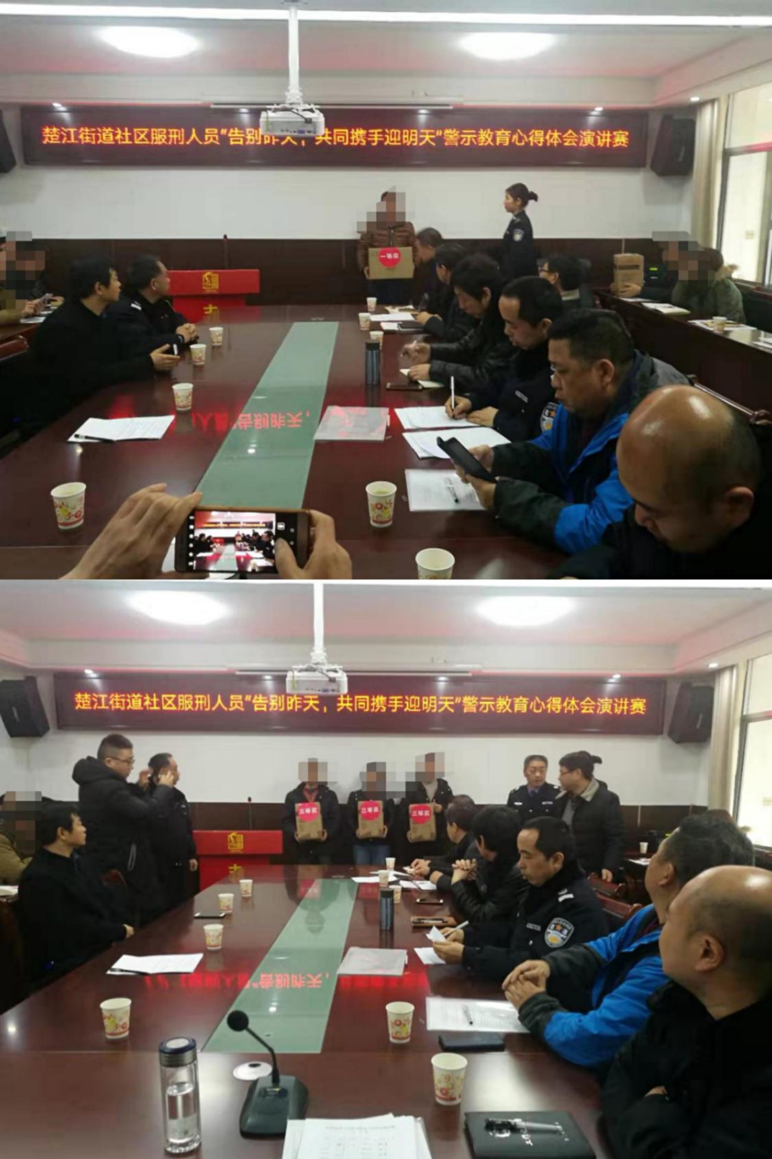 辖区内20名社区服刑人员先后分享了参加“告别昨天,共同携手迎明天”警示教育后的切身感悟,2名社区服刑人员作表态发言。参赛的社区服刑人员结合自身经历,以人为鉴,既有对自己犯罪行为的深刻反思,也有改过自新的决心和勇气,质朴的语言表达,积极向上的精神风貌,感染了现场的每一个人,令人耳目一新。经过精彩的角逐,比赛最终评出一等奖一名,二等奖二名,三等奖3名,并给予了相应的物质奖励。