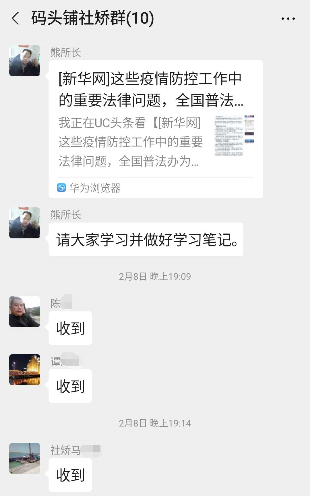 为避免聚集性感染,司法所工作人员在上级部门的指示下紧急取消了集中学习、集中劳动及指纹签到打卡等事项,但疫情期间对社矫人员如何进行管理、如何加强他们的思想学习又成了考验司法所工作人员的一道难题。为此,码头铺司法所所长熊守岩想到了一个新方法:利用微信群和“学习强国”平台组织他们进行线上学习,学习的重点内容除了疫情期间的自我防护知识外,更重要的就是疫情防控工作中的法律知识。特殊时期,特殊手段,适度的弹性不仅使得社区矫正工作得以继续顺利开展,同时也保护了社区服刑人员的各项权益。