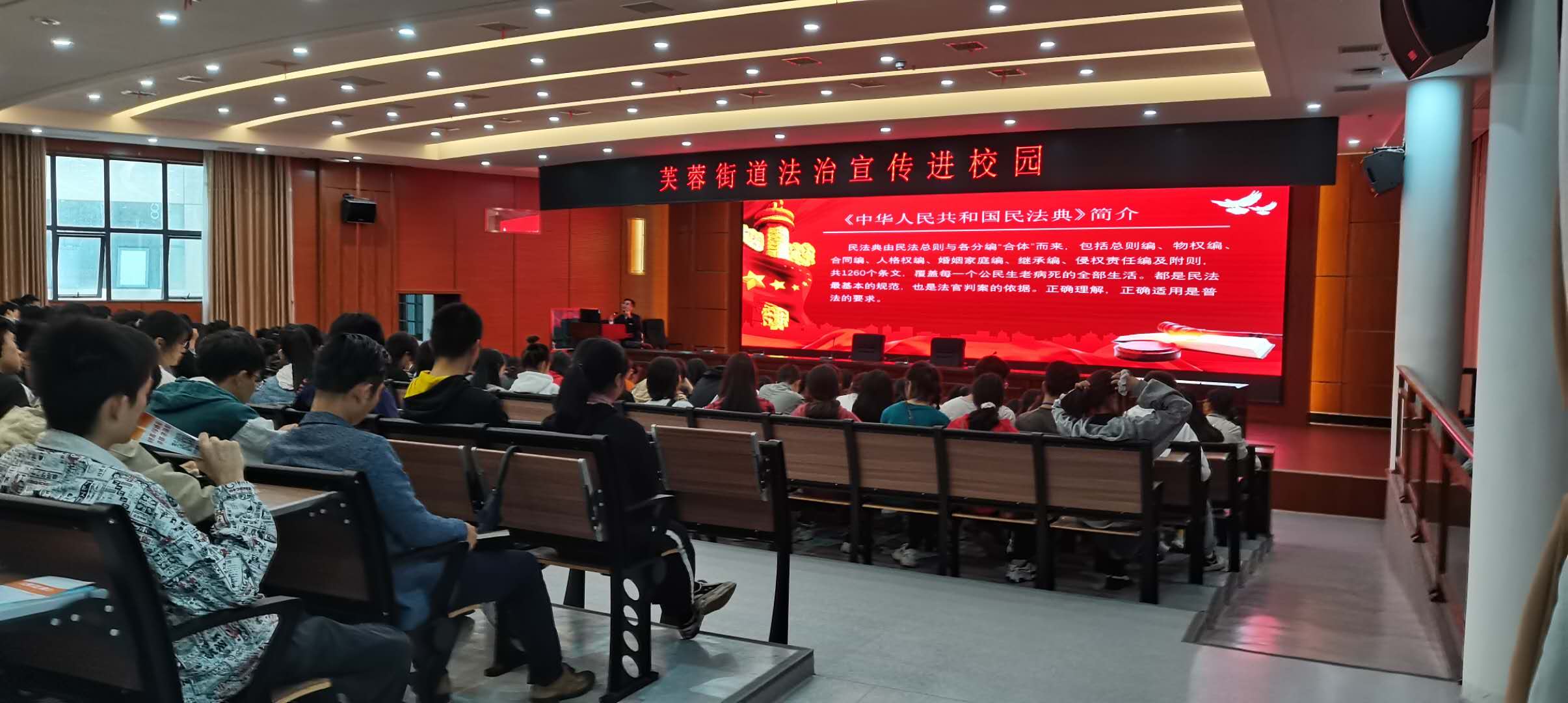 9月29日,武陵区芙蓉司法所联合芙蓉街道办事处和湖南博集律师事务所在常德市职业技术学院第一学术报告厅举办了一场主题为“拥抱民法典,走进法治新时代”的法治宣传进校园活动。300多名师生参加了本次活动,共计发放各类法治宣传资料600多份。