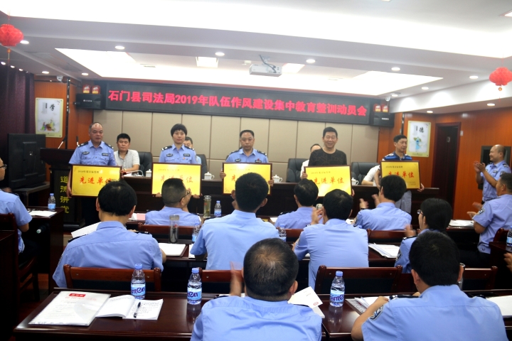 会议由石门县人民政府副县长、县公安局局长王汝国主持。大会上,县纪委驻县政法委纪检组长龚玉军,宣读了《石门县司法系统2019年队伍作风建设集中教育整训工作方案》;永兴司法所、宝峰司法所、维新司法所的负责人作了典型发言;司法局党组书记、局长刘波作工作报告;县政府党组成员、优化办主任张琪,宣读了《关于表彰2018年度石门县司法行政工作先进单位、先进个人的决定》,并举行了颁奖仪式。