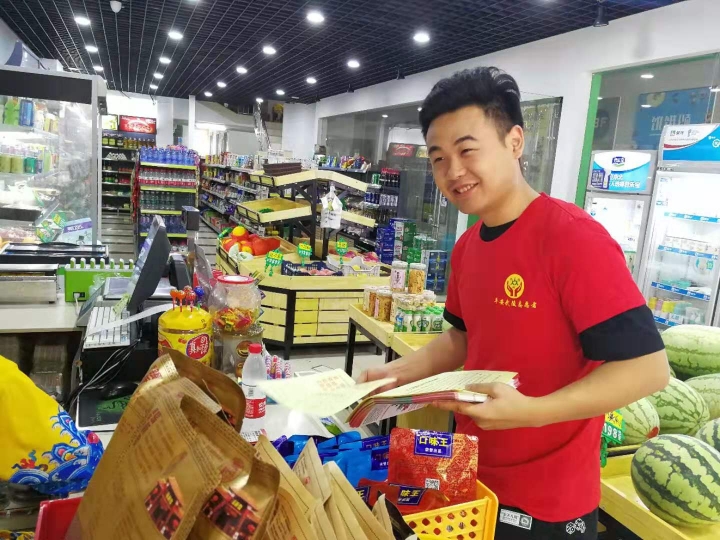 志愿者向店铺收银员讲解、宣传