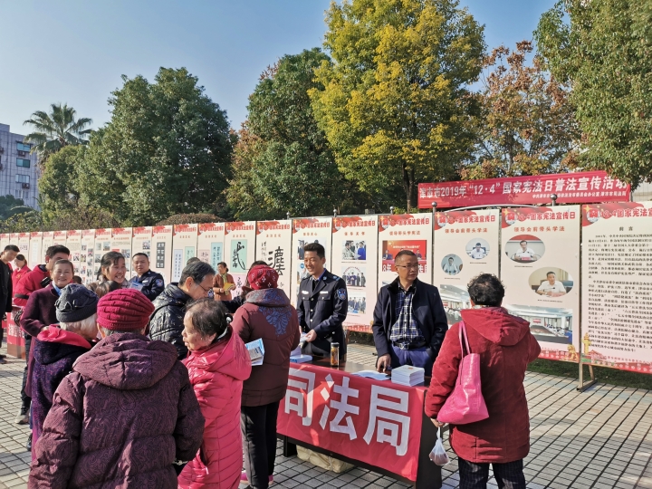 2019年12月4日是第六个国家宪法日,为进一步提升全市人民“尊崇宪法、学习宪法、遵守宪法、维护宪法、运用宪法”的浓厚氛围,中共津市市委全面依法治市委员会办公室联合市司法局、市公安局、市民政局和市文旅广体局在江南明珠法治文化广场举行了津市市2019年“12·4”国家宪法日大型普法宣传活动。