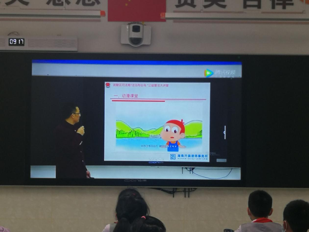 疫情之下,传统的普法教育方式受到制约。为了在防控新型冠状病毒肺炎的特殊时期,提高师生、家长们的“学法、守法”的自觉性,武陵区司法局认真筹备,湖南开旗律师事务所承办,由湖南开旗律师事务所律师、湖南文理学院副教授黄自强主讲,制作了专题普法教育片(时长约30分钟),区教育局在各中小学采取“线上”复学防疫法律宣传,将专题普法教育片作为“开学第一课”的重要内容。据统计,4月20日开学当天,全区已有3000余名师生在开学第一课中播放学习。