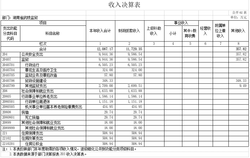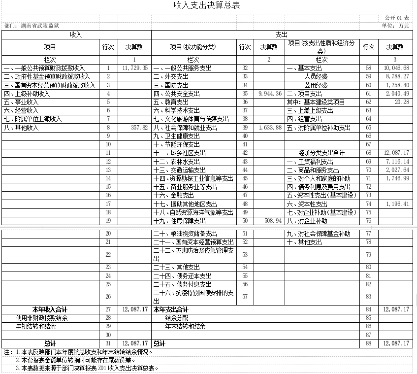 2022年度收入总计12087.17万元。与上年相比,减少1283.50万元,减少9.60%,主要是因为年初结转和结余资金相比上年有所减少,上年结转的资金主要为监狱搬迁后的狱政设施建设资金。支出总计12087.17万元。与上年相比,减少1283.50万元,减少9.60%,主要是因为年初结转和结余资金相比上年有所减少。