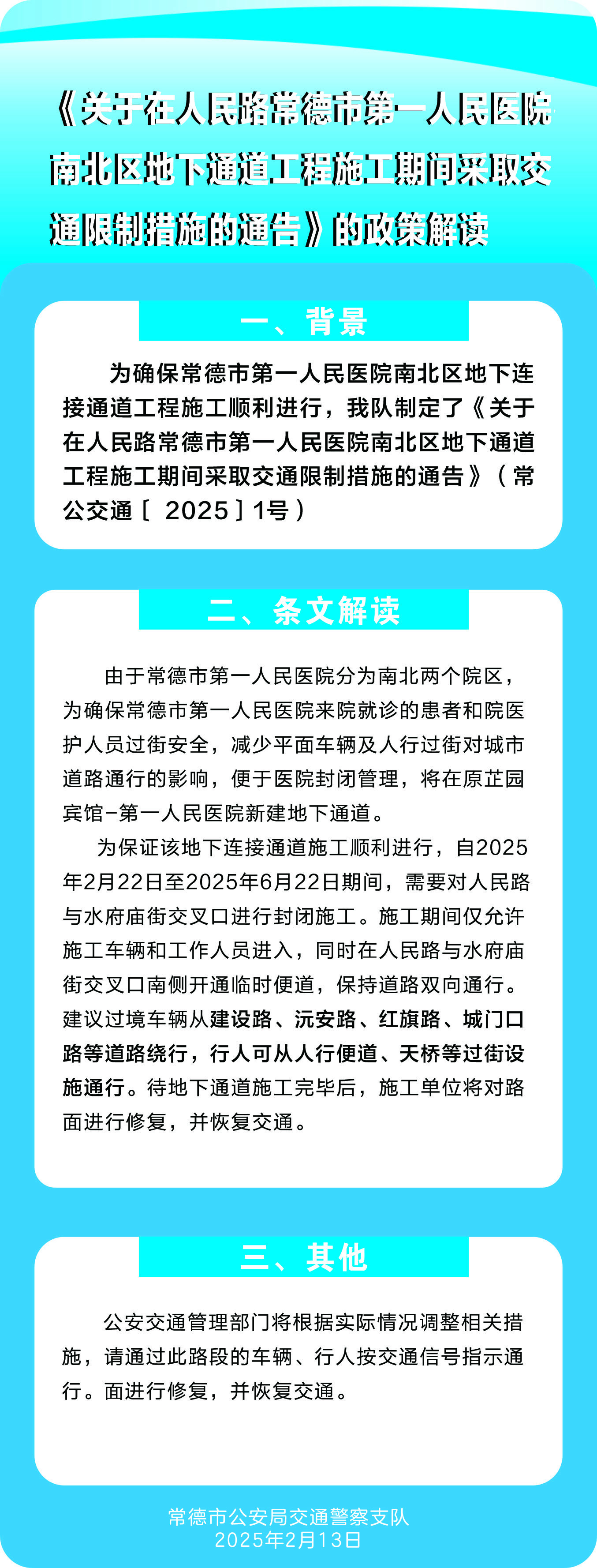 图文解读:常德市公安局交通警察支队关于在人民路常德市第一人民医院南北区地下通道工程施工期间采取交通限制措施的通告